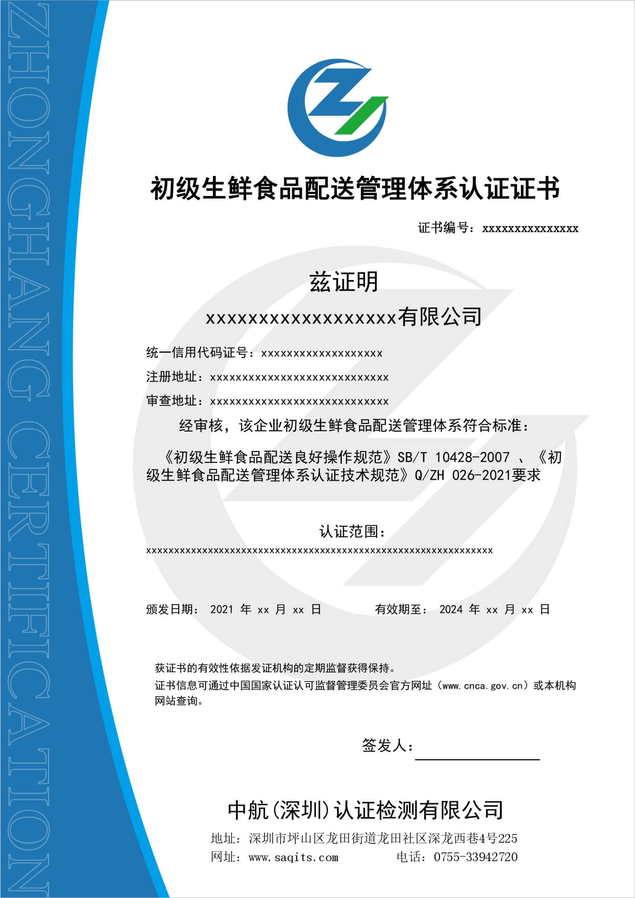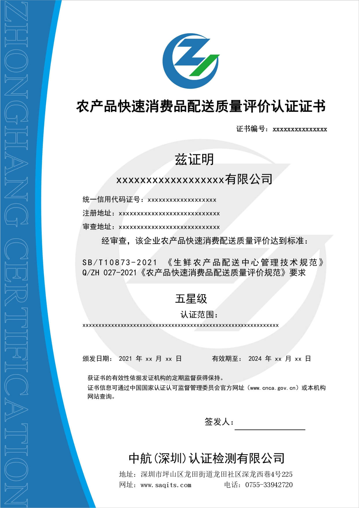 • 生鮮食品配送服務(wù)認(rèn)證證書