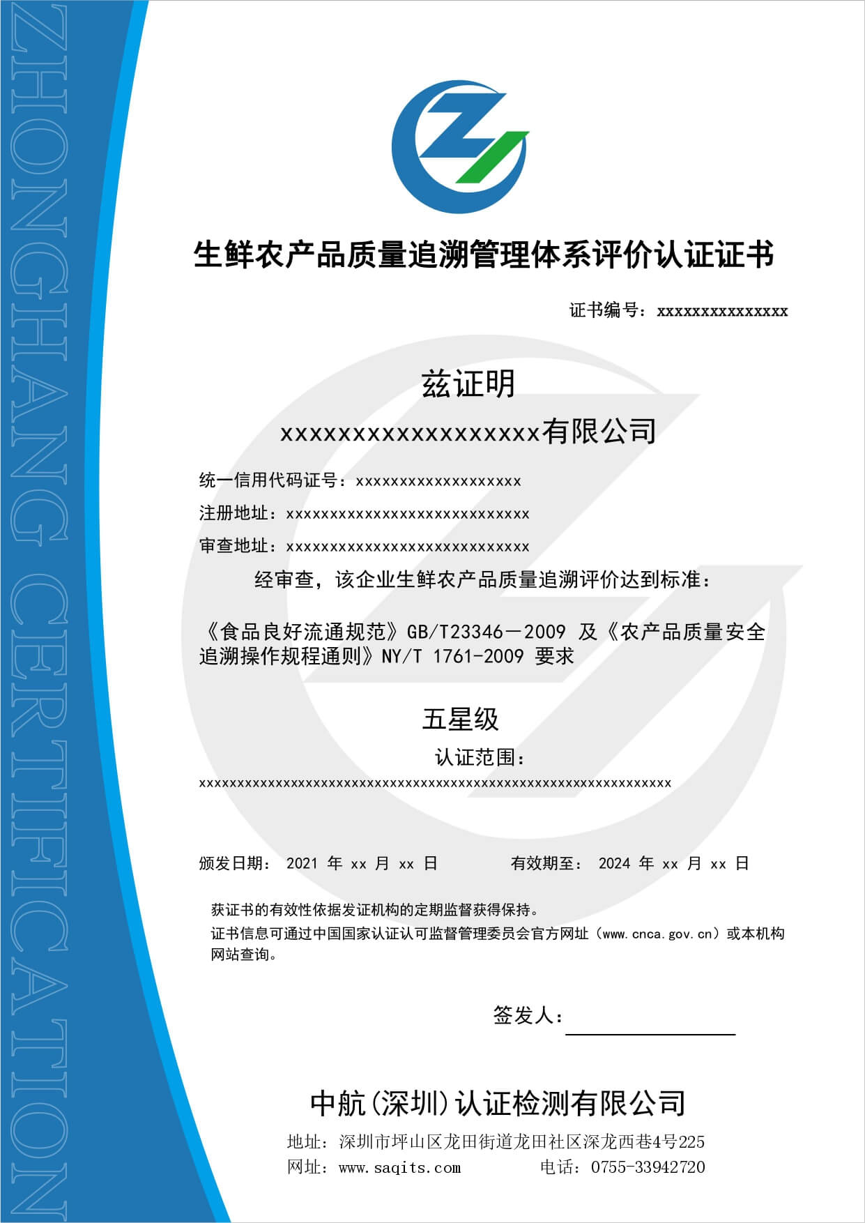 • 生鮮農(nóng)產(chǎn)品質(zhì)量追溯管理體系評價認(rèn)證證書